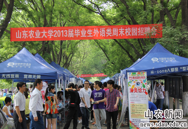 5月24日,由学工处主办,机电、水土、信息学院共同承办的理工类,及外语学院承办的外语类毕业生周末校园招聘会在望岳路举行。山东、北京、天津等省内外150余家用人单位进校揽才,提供工作岗位近3000个。