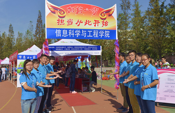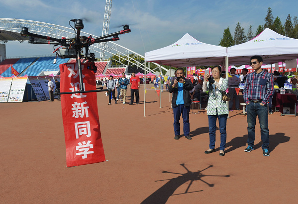 信息学院学生制作无人机在迎新现场吸引了众多新生和家长的目光