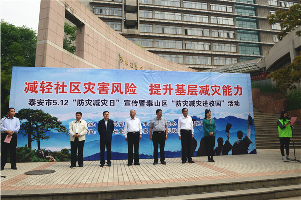 5月8日上午,泰安市“5.12防灾减灾日”宣传暨泰山区“防灾减灾进校园”活动在我校举办。泰安市副市长鞠向群、学校副校长吴衍涛、市民政局局长孙兰俊、泰山区副区长杨启典等出席活动。活动由泰安市打私办副主任彭恒玖主持。
