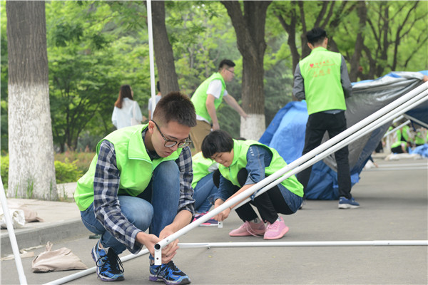 市防灾减灾办、民政局有关领导向山东农业大学志愿者队伍授旗并向学校和农大社区捐赠应急管理书籍及救灾装备。与会领导共同参观了“防灾减灾进校园”图片展并观看了大学生志愿者救灾帐篷搭建展示。