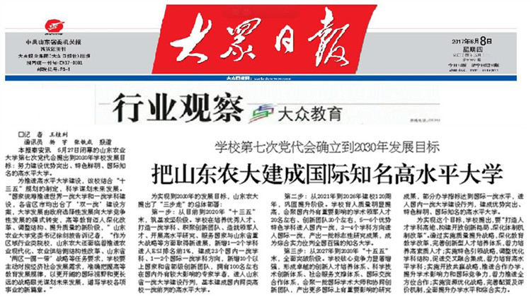 6月8日,《大众日报》以《学校第七次党代会确立到2030年发展目标:把山东农大建成国际知名高水平大学》为题,对山东农业大学胜利召开第七次党代会,科学谋划未来发展进行详细报道。