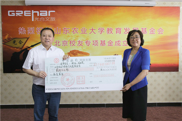 会上,徐剑波和王涛为专项基金管理办公室揭牌。光合文旅控股股份有限公司董事长王明荣向专项基金捐赠人民币20万元并代表北京校友发言,朱莉代表学校接受捐赠并颁发捐赠证书。王涛、袁学国等校友进行了个人捐赠。米庆华宣读了《山东农业大学教育发展基金会北京校友专项基金管理办法》。