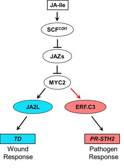 茉莉酸是来源于不饱和脂肪酸的植物免疫激素。其生物合成途径和化学结构与高等动物中的免疫激素前列腺素有极高的类似性。对应于机械伤害、咀嚼式昆虫和死体营养型病原菌的侵害,植物激活茉莉酸信号通路,启动并级联放大茉莉酸介导的转录重编程,从而产生有效的防御反应。但目前对茉莉酸激活植物免疫转录重编程的机理所知甚少。