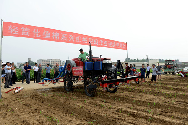 张晓辉团队研制的这些机械,有播种、覆膜、施药一体机,中耕松土除草机、施肥机、培土机、高地隙喷杆式喷药机等轻型植棉机械。这些机械轮番上阵,播种精准,覆膜整齐,培土合适、施肥利落、喷药均匀,引得大家啧啧赞叹。据张晓辉介绍,这些机械采用的都是模块化设计,稍加改造或简单组装,一台机械就可以拥有播种、覆膜、培土、施肥、喷药等多种功能,正常投入市场的话,一台机器也就三四万元,棉花种植户都能买得起;而且操控方便,易于在小型地块使用。棉田里全程机械化,能减少四分之三到三分之二的人工成本。