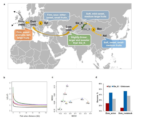 根据他们的研究结果,新疆塞威士苹果野生种沿古丝绸之路向西交流,逐渐演化形成当今的世界栽培苹果(西洋苹果);而随着民族交往的增加,新疆塞威士苹果在向东交流中,与山荆子等野生苹果种杂交、驯化而产生了中国早期的绵苹果,这为绵苹果在我国如何演化提供了明确答案。在西洋苹果演化过程中,果实质地增强、酸度降低;而在果实大小进化方面,该文首次提出了二步驯化模型;在遗传背景方面,由于苹果的自交不亲和特性,欧洲森林苹果等多种源基因的大规模渗透,导致栽培苹果具有较好的遗传多样性。