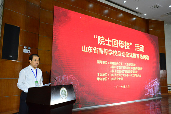 教育部关工委常务副主任孙成华也来到活动启动仪式现场。他说,“院士回母校”活动走进了有着111年办学历程的山东农业大学,这也是在山东举办的首场“院士回母校”的活动。山东农业大学培养了以中国科学院院士李振声、印象初、朱兆良、房建成,中国工程院院士余松烈、束怀瑞、山仑、于振文、李玉,国际欧亚科学院院士唐克丽等为杰出代表的各类优秀人才20余万人,他们在自己的岗位上为国家的建设做出了巨大的贡献。希望同学们树立与这个时代主题同心同向的理想信念,像院士学长那样传承好老一代科研工作者艰苦奋斗、矢志报国的高尚情操,为母校增光,为人生添彩,为中华民族伟大复兴的中国梦贡献力量。
