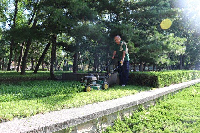 上午8:00,天气已经非常炎热,环卫工人马师傅开始了一天的忙碌。按照学校要求,物业管理中心制定了假期校园绿地养护方案,严格执行绿地养护标准,细化卫生区域,明确卫生责任,保障校园的清洁卫生,让学校师生在干净优美的校园环境下生活学习。