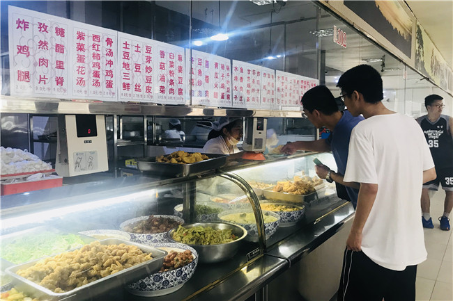 暑假期间,为了保障留校学生用餐,三个校区分别开放了部分就餐窗口提供学生健康、可口饭菜。饮食服务中心工作人员每天进行原材料查验、严格遵守加工操作规范,保障了学生饮食安全。中午12:00,餐厅工作人员忙着在给学生打饭。