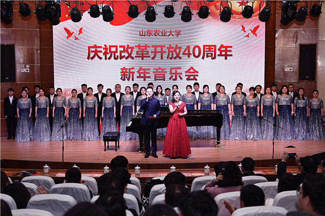 12月28日,山东农业大学庆祝改革开放40周年新年音乐会在文理大楼举办,师生同台演出为现场观众带来一场美轮美奂的视听盛宴。校领导张宪省、嵇景涛、王振林、张然、司金贵与师生们一起观看演出。