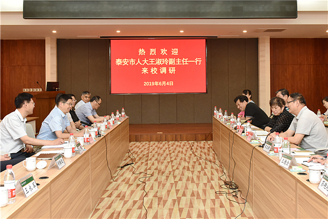 6月4日,泰安市人大副主任、市工商联主席王淑玲带领市人大科教文卫委员会、部分驻泰全国人大代表、泰安市人大代表和市直有关部门来校调研。校长张宪省会见客人并座谈交流,围绕进一步推进校地合作开展深入探讨交流。副校长嵇景涛参加调研。