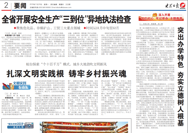 11月18日,大众日报刊发题为《突出办学特色 夯实立德树人根基》新闻报道,再次介绍我校“不忘初心、牢记使命”主题教育推进情况。