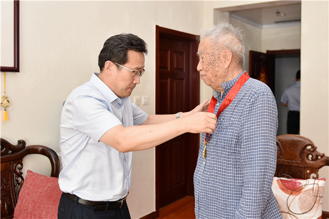 徐剑波代表学校向他们送上鲜花,并分别为束怀瑞、李毓椿佩戴上由党中央颁发的“光荣在党50年”纪念章。他细心询问老同志和专家学者的身体状况与工作、生活情况,向大家介绍学校发展近况,认真倾听他们对学校建设发展的意见建议。他说,学校所有成绩的取得,得益于一代代农大人团结拼搏、实干奋进打下的坚实基础,我们这一代农大人站在老一辈的肩膀上,才能走得更快更远,希望老同志继续发扬党的优良传统,为推动学校事业发展加油鼓劲;希望专家学者在科研攻坚道路上再立新功,为学校“双一流”建设作出新的更大贡献。