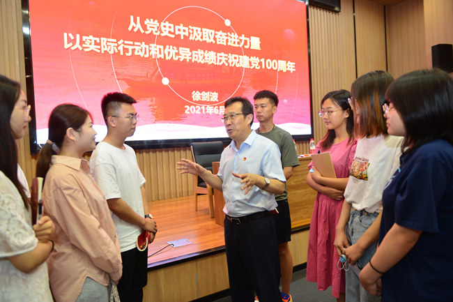 6月24日,党委书记徐剑波来到南校区西北片区,以《从党史中汲取奋进力量以实际行动和优异成绩庆祝建党100周年》为题,为党员干部和青年师生上党课,共同分享学习党史的感悟和体会。