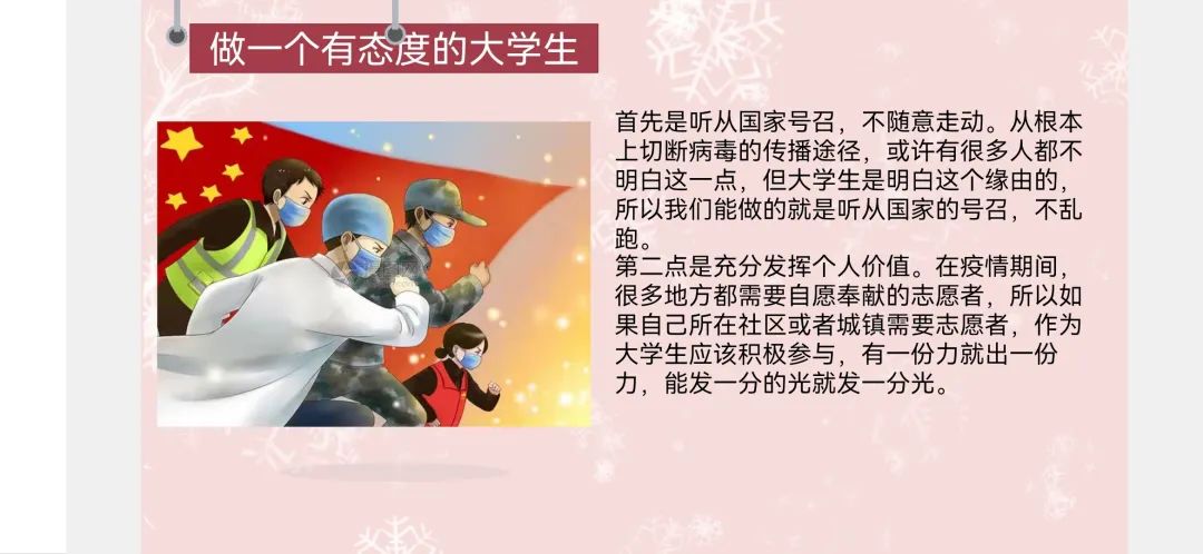 为提高同学们的疫情防范意识,根据当前疫情防控形势和常态化疫情防控要求,巩固来之不易的疫情防控成果,食科学院面向全体在校生开展疫情防控教育工作,通过举办丰富的校园活动巩固防疫意识、落实防疫要求。本次活动主要以班级制作PPT的形式展开,由每个班级选定一个有关疫情防控的主题并收集相关资料,制作主题项目、设计精致的PPT。在创作的过程中,同学们更深入的了解到了更多有关于疫情的知识,也对疫情防控工作的目的和要求有了更进一步的认识。面对近期疫情蔓延的严峻形势,加强对疫情的防控,确保全体师生平安度过流行疾病,是学院全体师生应尽的义务。通过本次疫情防控教育活动,同学们了解了更多疫情防控相关知识,对疫情防控的要求有了更深的认识,也进一步提高了自己的防疫意识。