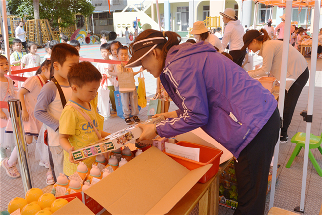 幼儿园开展了历时一个月的庆“六一”系列主题活动,分设“乐享食光、挑战自我、我行我秀、风采展示、家庭表现”五个小主题,以引导孩子们养成良好的学习和生活习惯,增强体能、获得技能等。儿童节上午,幼儿园在活动现场精心为孩子们准备了文具、食品、玩具等种类繁多的奖品。孩子们用前期在活动中挑战成功后获得的“六一欢乐币”不仅为自己购买了喜欢的美食、玩具、学习用品等,还为家人、老师选购了充满爱心的节日礼物,表达了自己的感恩之情。