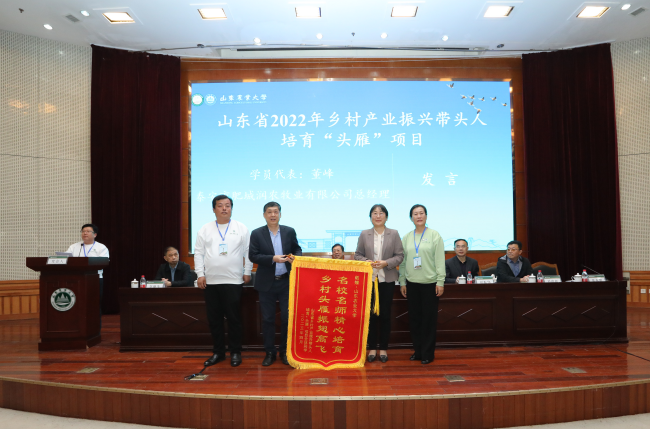 授课教师代表崔丙群、学员代表董峰分别作了典型发言,“头雁”全体学员为学校敬献“名校名师精心培育,乡村头雁振翅高飞”的锦旗。