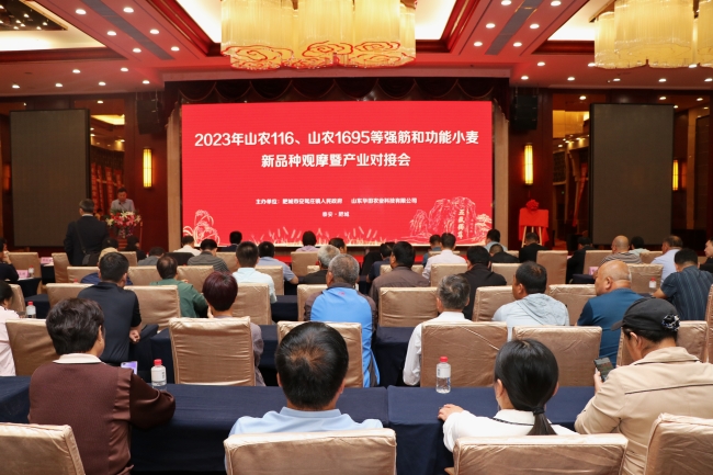 5月21日,2023年山农116、山农1695等强筋和功能小麦新品种观摩暨产业对接会在肥城市召开。山东省种子管理站副站长王桂娥,山东农业大学农学院党委书记王群、副院长蓝孝新,泰安市农业农村局四级调研员刘洪新,泰安市种子管理站站长徐加利,肥城市农业农村局副局长刘敏,肥城市安驾庄镇党委副书记、镇长乔石,农学院种子科学与工程系主任邓志英和部分教师代表参加活动。