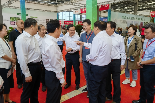 近日,由中国林学会、《中国花卉报》社主办的2023北方(昌邑)绿化苗木博览会暨第二十八届中国园林花木信息交流会在山东省潍坊昌邑绿博园举行,共有来自国内外350余家企事业单位参展。山东农业大学林学院受邀参展,学校党委常委、宣传部部长李广松出席开幕式并向与会领导专家介绍有关情况,林学院党委书记赵明月、院长桑亚林带领学院20位教师参加展览会。