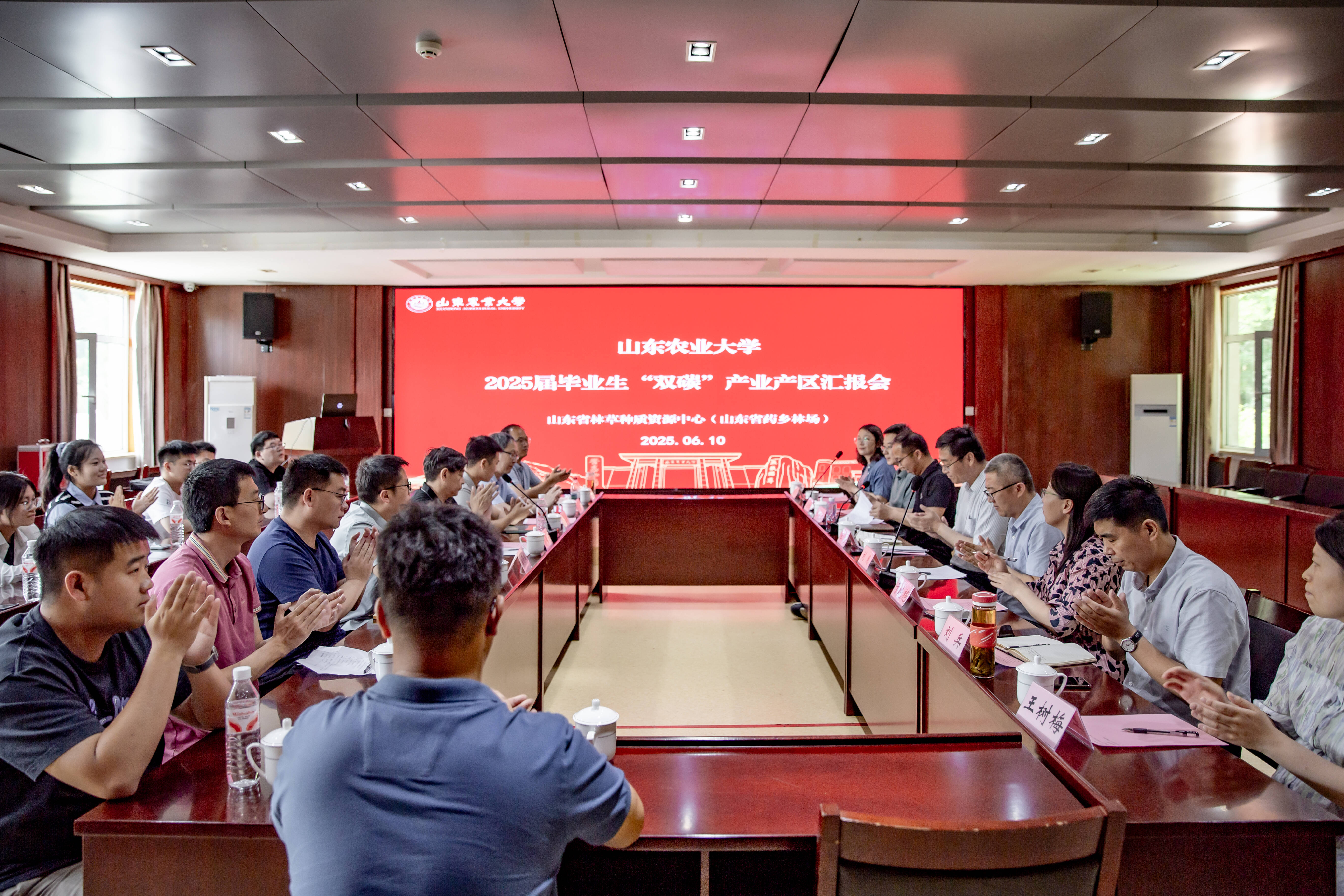 山农融媒6月16日讯 近日,山东农业大学2025届毕业生“双碳”产业产区汇报会在山东省林草种质资源中心(山东省药乡林场)举行。学校党委常委、副校长王勇,山东省农业农村厅正高级统计师刘用,山东省林草种质资源中心(山东省药乡林场)专职副书记仝伯强出席会议。