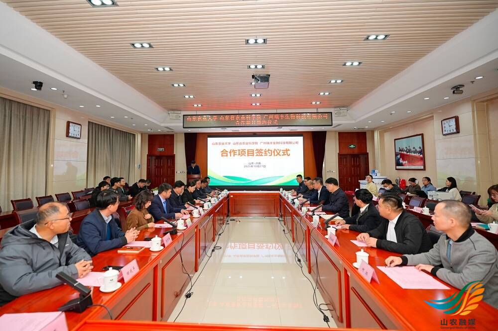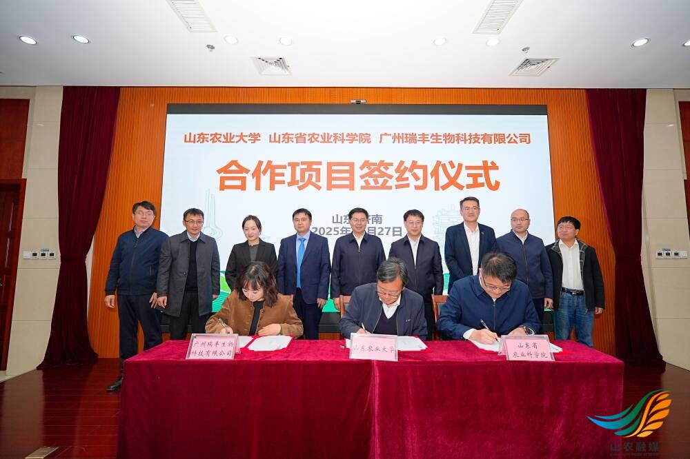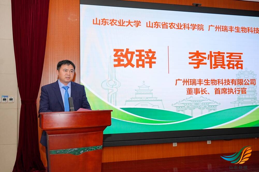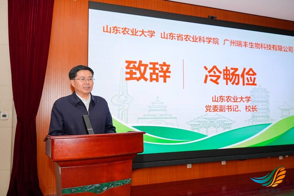冷畅俭代表山东农业大学向长期以来关心支持学校发展的领导专家表示衷心感谢,并简要介绍了学校发展历史和近期办学治校取得的成绩。他表示,山东农业大学、广州瑞丰生物科技有限公司与山东省农科院各具特色、各有优势,三方签署合作协议是优势互补、资源共享的必然选择,也是共担使命、共创未来的崭新起点,山东农大将以最大诚意、最优资源、最实举措,全力推动合作协议落地见效,期待通过合作,共同突破一批关键核心技术,推动一批重大成果转化,培育一批高水平产业人才,携手打造院校企协同创新的示范标杆,为保障国家粮食安全、建设更高水平“齐鲁粮仓”作出新的更大贡献。